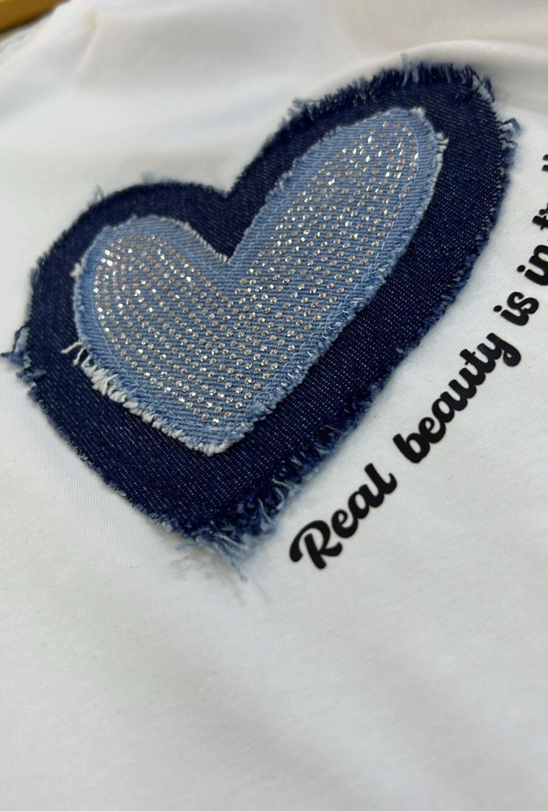La Camiseta Oversize con corazón bordado y apliques es la fusión perfecta entre moda y comodidad. Su diseño oversize aporta frescura y libertad de movimiento, mientras que el detalle bordado en forma de corazón con apliques únicos la convierte en una prenda especial y diferente.