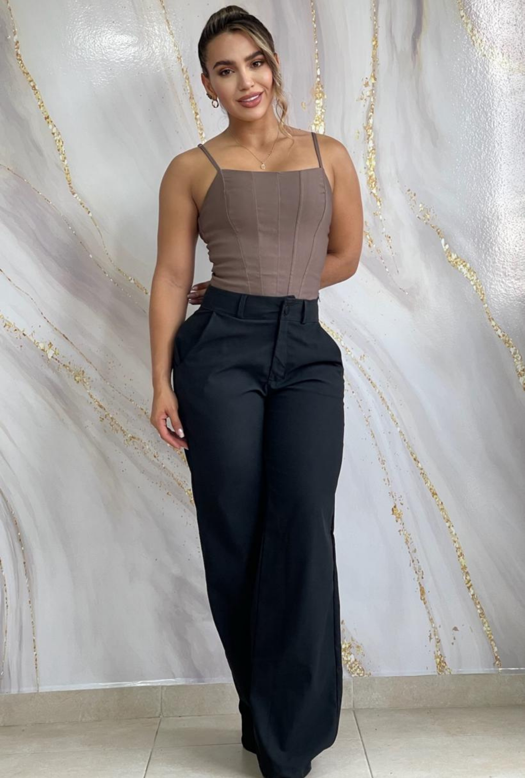 Con un tiro alto que define la cintura y una silueta de bota ancha que alarga tus piernas, estos pantalones son la definición de sofisticación contemporánea. Ya sea para un evento nocturno o para elevar tu look de día, su textura y caída perfecta te garantizan una presencia poderosa y una comodidad sin precedentes.